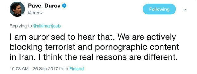 مدیر شرکت تلگرام به این شکایات واکنش نشان داد و متنی در کانال تلگرام خود منتشر کرد و در این متن اعلام کرد که ایران به دلیل اینکه دادستان تهران علیه من اعلام جرم کرده است جز کشورهایی است که نمی‌توانم به آنجا سفر کنم. تاکنون بیش از 40 میلیون ایرانی در تلگرام عضو شدند و ما حتی یک بایت از اطلاعات کاربران را نه به دولت ایران و نه به هیچ دولت دیگری نداده‌ایم.