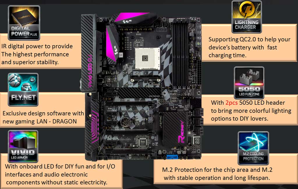 برای نخستین بار شاهد پوشش همزمان دو مسیر PCI Express 3.0 X16 در چیپست های AMD هستیم؛ اورکلاک کامل با رابط گرافیکی تقریبا پیچیده ی این مادربردها، تنها در چیپست X370 قابل یافت است. اورکلاک پردازنده های RYZEN به همراه خنک کننده های افراطی CN2 نیز از جمله ویژگی های این محصولات است. این مادربردها به دلیل پیشرفت پلتفرم جدید AMD قادر به پشتیبانی از دو مسیر DDR4، حافظه های SATA Express، حافظه های M.2، رابط های USB-C و PCI-E 3.0 هستند. چیپست B350 نیز در کنار برخی امکانات خود، یک پله پایین تر از X370 جای می گیرد؛ پوشش کمتر باس (BUS) های PCI از جمله این تفاوت ها است. مادربرد Biostar B350 GT5 نیز پرچمدار مدل های B350 خواهد بود. این مادربرد به یک مدار تغذیه 7 فاز رگولاتور مجهز گشته و امکانانی مشابه با Biostar X370 GT5 را حمل می نماید.