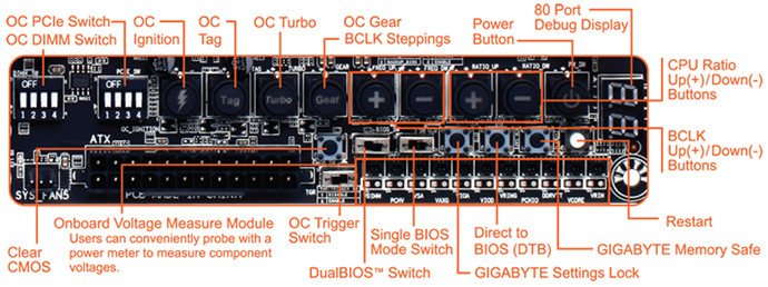 در مادربرد های جدید سری OC شرکت گیگابایت، علاوه بر قابلیت فعال یا غیر فعال سازی دستی اسلات های PCI، این امکان برای اسلات های حافظه رم نیز وجود دارد و کلید های اختصاصی برای افزایش یا کاهش فرکانس، روشن و ریست کردن سیستم، سوئیچ بین بایوس، اورکلاک خودکار، فعال سازی حالت توربو برای پردازنده و Clear CMOS در نظر گرفته شده است. مشخصات و جزئیات رکورد های اورکلاک ثبت شده را می توانید در بخش آلبوم تصاویر مشاهده کنید.