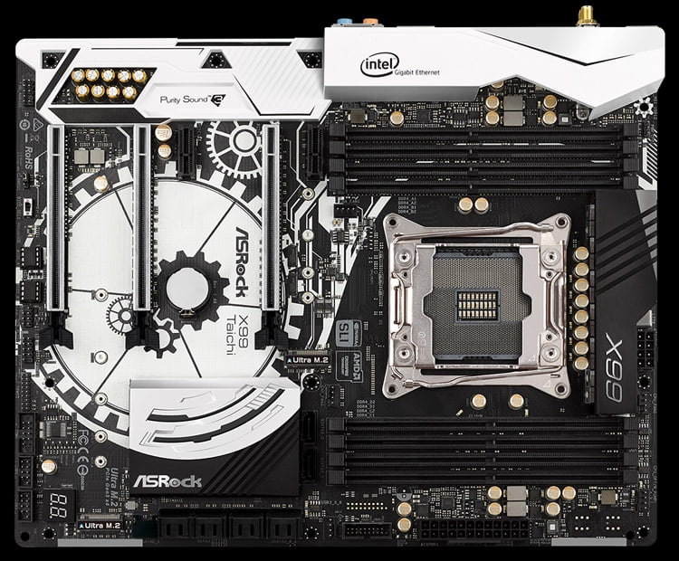 ازراک در مدار چاپی از 8 لایه استفاده کرده است و دو لایه نیز از پوشش مسی تشکیل شده است. دلیل این طراحی ارائه سیگنال پایدار و عدم تداخلات فرکانسی است. از سوی دیگر دمای PCB در مواردی همچون اورکلاک نیز کاهش پیدا می کند. ASRock X99 TAICHI نیز به 8 اسلات حافظه DDR4 مجهز شده است که می تواند از ماژول هایی با فرکانس 3300 مگاهرتز پشتیبانی نماید. در زمینه اسلات های PCI نیز شاهد تعدد مناسبی هستیم. تایچی از 3 اسلات PCI Express 3.0 16X به همراه دو اسلات PCI Express 2.0 x1 می تواند نصب انواع کارت های توسعه را امکان پذیر نماید. این اسلات ها به وسیله فلز اضافی تقویت شده اند تا از دفرمه گی مادربرد جلوگیری نمایند. به منظور نصب حافظه های پر سرعت M.2 یک ماژول موجود است که از مسیر PCIe X4 نسل سوم استفاده می کند. یک درایو SSD با سرعت 32 گیگابیت در ثانیه می تواند بر روی آنها نصب شود. همچنین تایچی می تواند از اسلات های U.2 PCIe Gen3 x4 SSD نیز پشتیبانی نماید. این مادربرد از سخت افزار اضافی به منظور ارتباط بی سیم برخوردار است. پشتیبانی از بلوتوث و باند های 2.4 و 5.0 گیگاهرتز نیز توسط آن انجام می شود. دو جایگاه نصب آنتن نیز در انتهای برد موجود است. دو درگاه RJ45 با هدف نصب سوکت های شبکه در بخش I/O های موجود است. دو تراشه Giga PHY Intel I218V و GigaLAN Intel I211AT نیز در این دو بخش نصب شده اند.