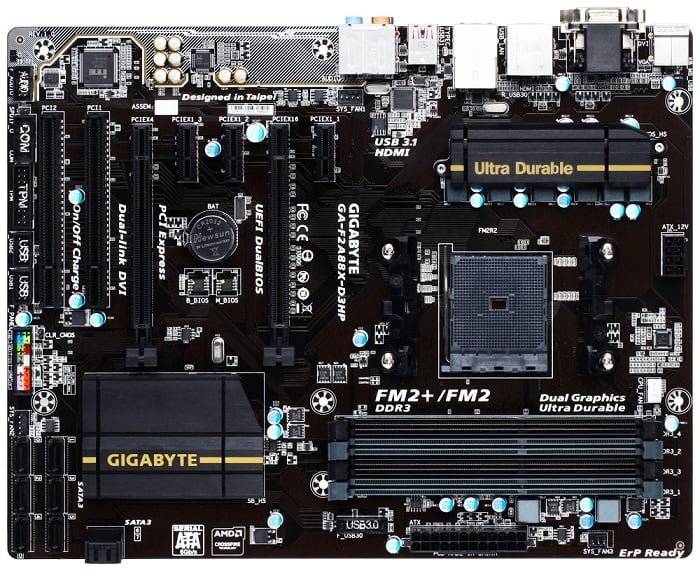 این محصول از پردازنده و APU های AMD در سوکت FM2+ پشتیبانی کرده و دارای چیپست A88X است.این مادربرد در کلاس ATX تولید شده است و دست گیگابایت و کاربران برای انعطاف خدمات دهی آن بسیار باز است.از آنجایی که محصولات AMD از حافظه های رم DDR4 پشتیبانی نمی کنند،گیگابایت استفاده از حافظه های DDR3 را در فرکانس بسیار بالا 2400 مگاهرتز محیا کرده است.4 اسلات رم بر روی مادربرد قرار دارد که قادر به پشتیبانی از 64 گیگابایت حافظه هستند.به مانند همیشه در کنار اسلات های رم،مدیریت تغذیه 24 پین مادربرد وجود دارد و در کنار سوکت پردازنده نیز رابط 8 پین تغذیه این قسمت به چشم می خورد.در قسمت اسلات های توسعه،یک اسلات PCI-E 3.0 16X و یک اسلات PCI-E 2.0 X16 وجود دارد.علاوه بر این ها،سه اسلات PCI-E 2.0 X1 و 2 اسلات PCI قدیمی نیز موجود هستند.در قسمت اسلات های توسعه دست کاربران برای انجام هر کاری کاملا باز است.