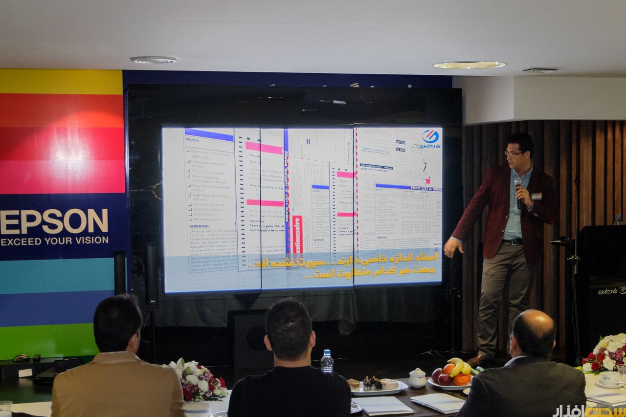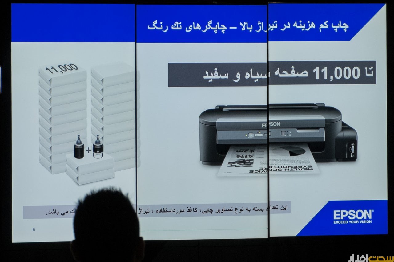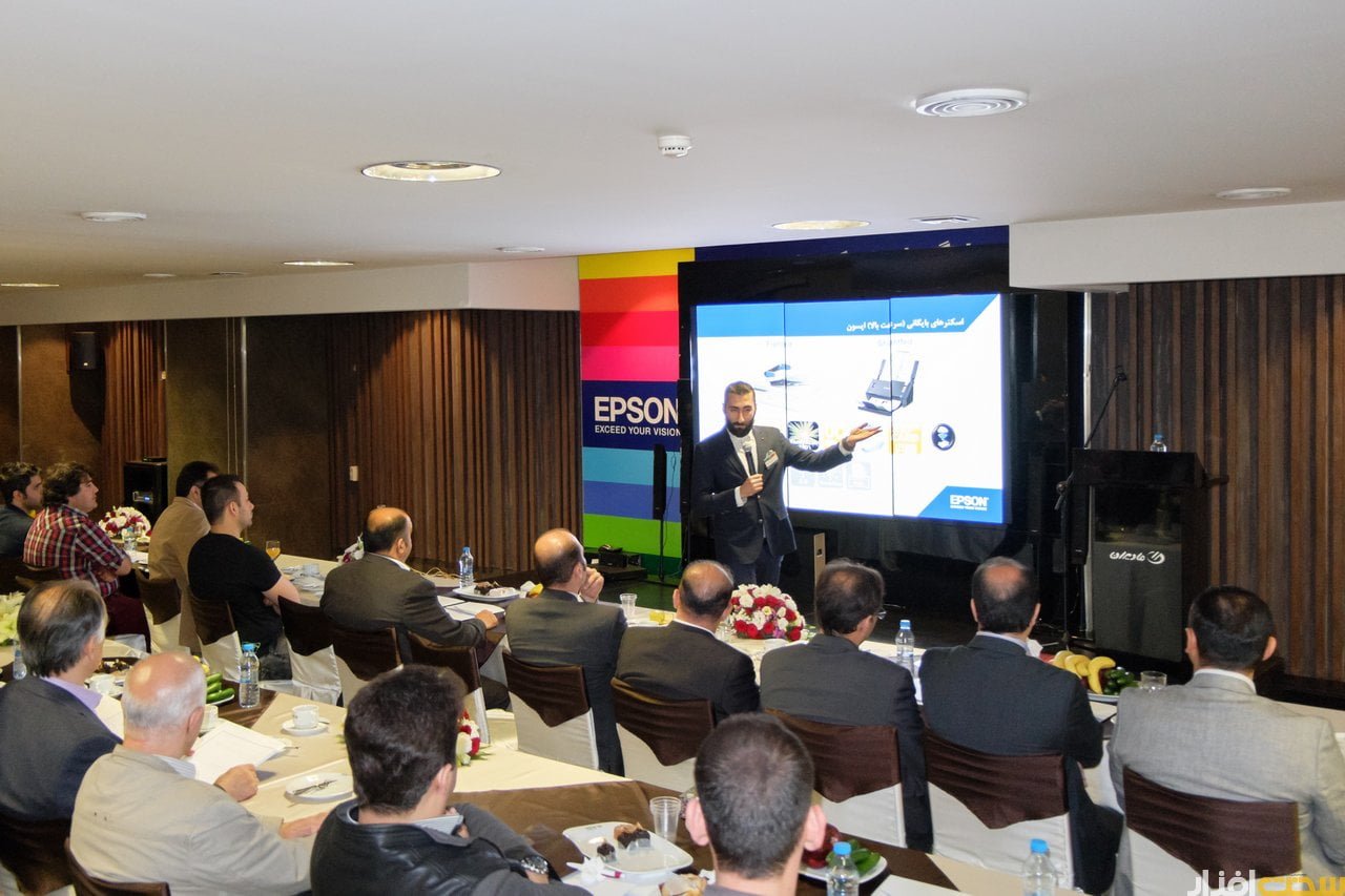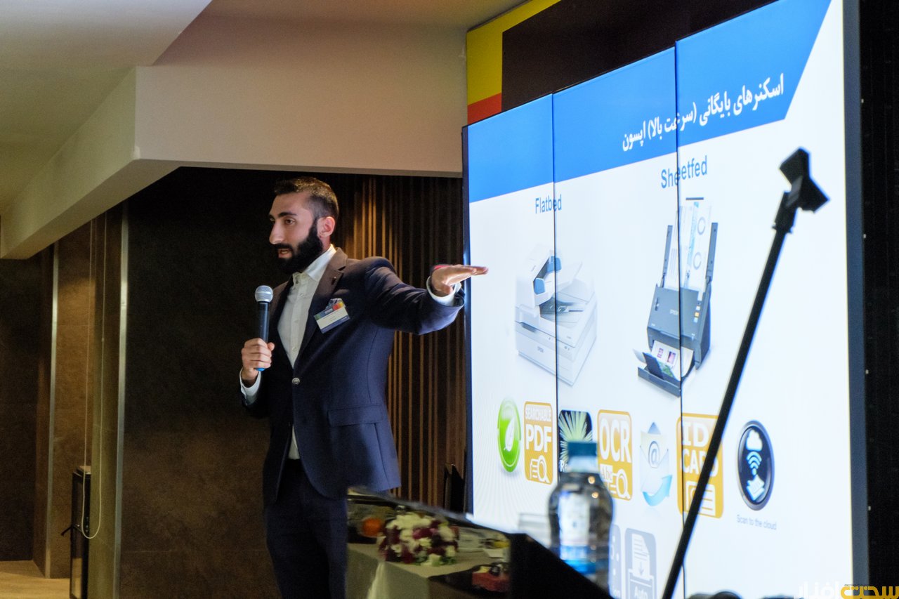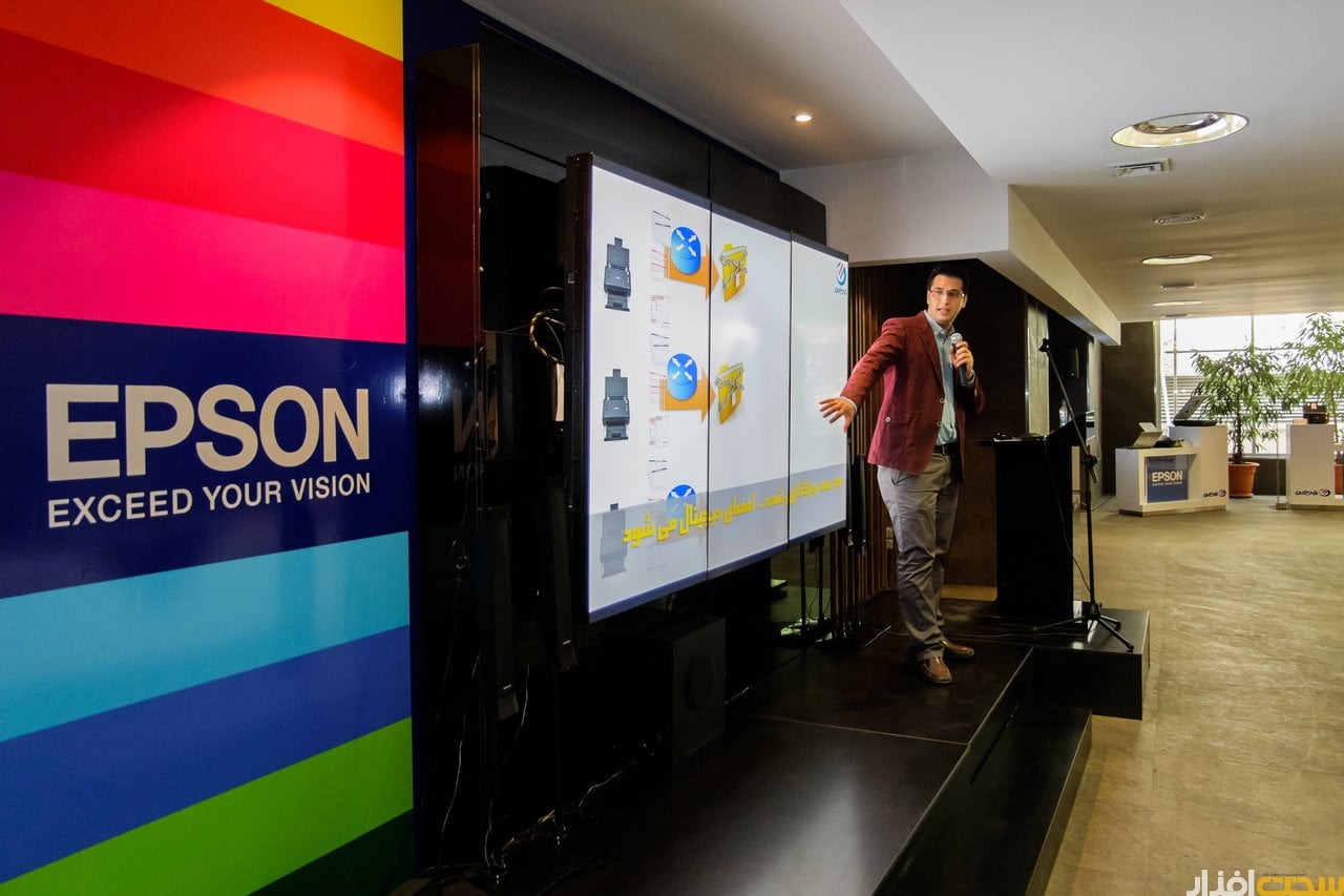 پس از ایشان، آقای ناصر خانی کارشناس فروش پرینتر مادیران توضیحاتی فنی درباره پرینترهای اپسون ارائه دادند. به گفته ایشان چاپگرهای جدید و نیز تکنولوژی جدید به کار رفته در آنها صرفه جویی اقتصادی قابل توجهی در پی دارند. در پرینتر های جدید و با استفاده از تانکر های پر حجم و مواد مصرفی با قیمت مناسب این فرصت را فراهم کرده تا بتواند با صرف ۴۰ هزار تومان ۶ هزار صفحه پرینت رنگی یا 12 هزار صفحه پرینت سیاه و سفید داشته باشیم. علاوه بر این، استفاده از اتصال Wi-Fi و نرم افزار های اختصاصی قابل استفاده روی موبایل و تبلت باعث شده تا سطح کاربرد و انعطاف پذیری این دستگاه ها افزایش یابد.