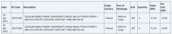 اینطور که از شواهد پیداست، مایکروسافت گوشی تازه ای را برای پشت سر نهادن مراحل تست راهی هندوستان کرده است. بر پایه آنچه در وب سایت Zauba (که واردات و صادرات کالا در هند را زیر نظر دارد)، مایکروسافت دو سری گوشی به شماره مدل RM-1127 را با صفحه نمایش 4.7 اینچی از فنلاند به این کشور وارد کرده است.این گوشی 71 دلار آمریکا می ارزد، که نشان از تعلق آن به رده ارزان قیمت ها داشته و برای کاربران بسیاری در دسترس خواهد بود.