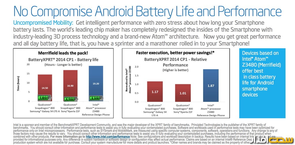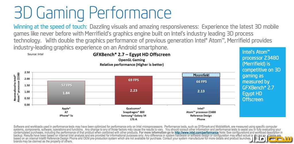اواسط سال گذشته، چیپ‌ست‌های اینتل تنها در 0,2 درصد از گوشی‌های هوشمند و شش درصد از تبلت‌های بازار پیدا می‌شدند. حالا این کمپانی می‌خواهد به شکلی جدی‌تر در این وادی وارد شده و معادلات را تغییر دهد. اینتل در نمایشگاه MWC 2014 از چیپ‌ست‌های 22 نانومتری و همچنین آخرین مودم‌های LTE خود پرده‌برداری کرد. Moorefield و Merrifield نام دو محصول جدید اینتل هستند و همان‌طور که در تصویر پایین مشخص است، هر دو برای بازار محصولات میان قیمت در‌نظر گرفته شده‌اند. اینتل برخلاف محصولات مخصوص کامپیوتر‌های دسکتاپ که در تمام حوزه‌های حرفه‌ای تا میان قیمت و ارزان قیمت حضوری فعال دارد، تصمیم گرفته تا در دنیای محصولات موبایل، ابتدا به‌سراغ بازار میان قیمت‌ها و ارزان قیمت‌ها برود (هرچه باشد این بخش از بازار بیشترین میزان نفوذ و خریدار را میان تولیدات همراه در اختیار دارد).در نیمه اول سال 2014 اینتل چیپ‌ست Merrifield را معرفی خواهد کرد. این مجموعه به پردازنده دو هسته‌ای بر‌پایه معماری Silvermont مجهز شده و در واقع یک نسخه موبایلی از معماری Bay Trail به حساب می‌آید. با آنکه اینتل Merrifield را در مجموعه محصولات میان قیمت قرار داده، اما انتظار دارد تا این چیپ‌ست بتواند با Snapdragon 800 و Apple A7 رقابت کند!