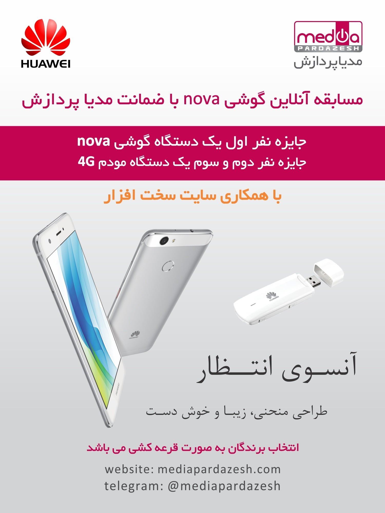 فراموش نکنید که فرصت شرکت در این مسابقه تا پایان سال 95 می باشد. فرصت را از دست ندهید. شاید شما برنده گوشی جدید هواوی و مودم های 4G این شرکت با گارانتی مدیاپردازش باشید!