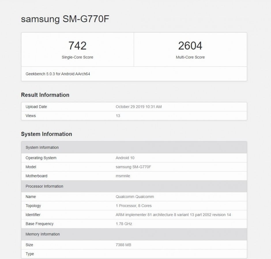 حال بعد از گذشت چند هفته از این خبر، گلکسی اس 10 لایت در گیک بنچ با مشخصاتی شبیه به همان مشخصاتی که در شایعات ذکر شده بود مشاهده شده است. اس 10 لایت با شماره مدل SM-G770F در گیک بنچ 5 نمره 742 برای پردازش تک هسته‌ای و نمره 2604 را برای پردازش چند هسته‌ای کسب کرده است.