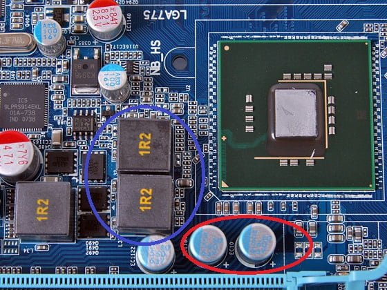 چوک و خازن در مدل های متفاوت،وظیفه ذخیره و القاء جریان را بر عهده دارند.در بسیاری از کارت گرافیک های جدید،خازن ها با نمونه های جامد و جدید تعویض شده است و چوک ها نیز مجهز به هسته فریت شده اند.اما در بسیاری از موارد نیز همچنان شاهده استفاده از قطعات سنتی هستیم.خازن ها در اثر استفاده طولانی در خطر خرابی هستند.باد کردگی و یا حتی ترکیدن سطح بالایی خازن ها،بهترین نشانه برای درک خرابی های آنها است.به طور معمول چوک ها مقدار کمی نویز صوتی را از خود خارج میکنند.اما در صورتی که این صدا به بیش از حد نرمال رسید،نشان از خرابی آنها است و باید فورا کارت گرافیک از مدار خارج گردد.چوک ها وظیفه جلوگیری از سیکل های منفی را بر عهده دارند و خرابی آنها به سرعت بر روی قطعات دیگر تاثیر گذار خواهد بود.رطوبت نیز یک عامل موثر در خرابی این دو قطعه به شمار میرود.