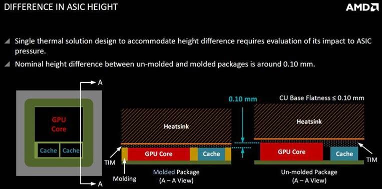 در نتیجه AMD فورا دست به کار شده و اسلاید هایی را برای شرکای تجاری خود ارسال کرده است؛ در این اسلاید ها، سیلیکون های گوناگون به تصویر کشیده است و همانطور که می بینید، توصیه شده است که این اختلاف سطح با مواردی مانند خمیر سیلیکون پر گردد. کمبود تراشه های HBM2 و پیچیدگی تولید آن تا کنون به حد کافی این شرکت را به دردسر انداخته بود و اینبار گریبانگیر تولید کنندگان سخت افزار را نیز خواهد گرفت. تا کنون هیچ یک از کمپانی های مورد نظر بیانیه ای را در این زمینه منتشر نکرده است. این اختلاف سطح می تواند در تعویض کولر توسط کاربران و یا سرویس کارت گرافیک، مشکل ساز باشد.