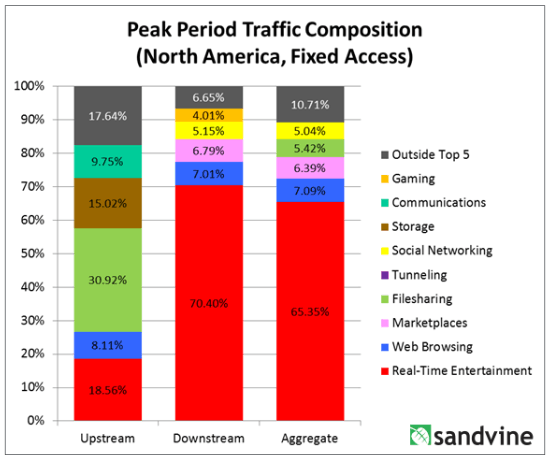 مؤسسه Sandvine یکی از معتبرترین نهاد های آمارگیری در جهان است که بیشتر تمرکز آن بر روی موضوعات وابسته به اینترنت است.در گزارش های سالانه این موسسه در رابطه با استفاده از حجم اینترنت،مقادیری بسیار مهم به دست می آید که گاها تعجب آور است.در آخرین آماری که در چند روز گذشته منتشر شده است،70% از مصرف ترافیک تمامی قسمت های آمریکایی شمالی،به استفاده از شبکه های پخش آنلاین محتوای ویدویی و رسانه های صوتی وابسته اختصاص دارد.شبکه های پخش آنلاین مانند نت فلیکس در چند سال گذشته با پیشرفت چشم گیری مواجه شده اند.در این لیست نام شرکت هایی بسیار معروف به همراه آمارهای آنها به چشم میخورد.شبکه نت فلیکس با اختصاص 37.1% درصد از ترافیک اینترنت آمریکایی شمالی در رتبه اول این آمار قرار گرفته است.پس از آن غول شبکه اشتراک گذاری محتواهای ویدویی یعنی یوتیوب نیز با کسب آمار 17.85% استفاده از ترافیک،در رتبه دوم ایستاده است.شبکه پخش محتوای آنلاین آمازون با وجود نو پا بودن و کاربران کمتر نیز دارای 3.11% از این آمار است.بر طبق این آمار مصرف ترافیک اینترنت به منظور تماشای محتوا و گوش دادن به موسیقی در حداکثر 5 سال گذشته دو برابر شده است.پس از آن شبکه اجتماعی فیسبوک نیز با آماری در حدود 16% در این لیست گنجانده شده است.نکته جالب توجه حرکت شبکه های پخش آنلاین به سمت دقت 4K و پشتیبانی از کدک های صوتی و استاندارهای جدید است که باعث افزایش حجم استفاده از ترافیک می گردد.این مورد به خودی خود می تواند سرویس دهنده های ISP را به چالش بکشد.پهنای باند مورد استفاده برای تماشای ویدیوی 4K دارای بیت ریت بسیاری بالایی است که قاتل ترافیک خواهد بود.شمال آمریکا یکی از مهمترین نقاط جهان برای بررسی است که کمپانی های تولید کننده تلویزیون نیز گاها این قسمت را برای کسب نتایج کلی در نظر می گیرند.