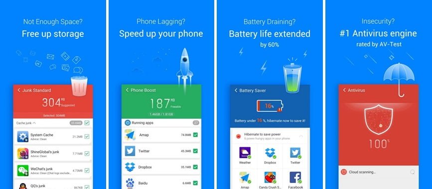 این اپلیکیشن از بخش های مختلفی تشکیل شده است که می توان به Junk Files، Phone Boost، Antivirus، Battery Saver، App Lock، CPU Cooler و دیگر قابلیت های این چنینی برای بهبود عملکرد گوشی اشاره کرد. در ادامه مختصری از عملکرد بخش های مختلف این اپلیکیشن را ارائه خواهیم کرد.