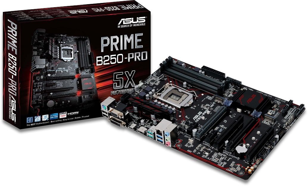 به عنوان یکی از جدید ترین محصولات میان رده اما با قابلیت های بالا و درخور توجه، به سراغ مادربرد ASUS PRIME B250-PRO ایسوس به عنوان یک سازنده مطمئن سخت افزار، همواره یکی از برترین انتخاب های ما بوده است. این مادربرد از چیپست B250 بهره می برد که امکاناتی نزدیک به Z270 دارد. مادربردهای Prime 200 با قابلیت پیشتاز 5X Protection III مهندسی شده‌اند، از بهترین قطعات استفاده می‌کنند، برترین طراحی مدار را دارند و از استانداردهای دشواری برای تضمین کیفیت و دوام بلندمدت استفاده می‌کنند. فناوری اختصاصی SafeSlot نیز در این مادربرد به خدمت گرفته شده است که SafeSlot Core درگاه اختصاصی PCIe ایسوس است. این قابلیت دارای یک طراحی مستحکم است که توسط یک قلاب مخصوص به مادربرد محکم می‌شود و باعث می‌شود Safeslot Core نسبت به درگاه‌های استاندارد 1.6 برابر قدرت نگهداری بیشتر و 1.3 برابر مقاومت بالاتر در برابر شکستگی درگاه‌ها داشته باشند. ASUS LANGuard یک لایه حفاظت سخت‌افزاری از شبکه است که با استفاده از فناوری اتصال سیگنال‌ها و بهترین خازن‌های مقاوم در برابر EMI ارتباط مداوم و عملکرد بهتر را تضمین می‌کند. علاوه بر این از قطعات مقاوم برای تخلیه الکتروستاتیک و موج‌های الکتریکی استفاده شده است تا مقاومت بیشتری در برابر الکتریسیته ساکن و موج‌های الکتریکی داشته باشند. همچنین ASUS ESD Guards در برابر تخلیه الکتروستاتیک تا +/-10kVبرای تخلیه هوایی و +/- 6kVبرای تخلیه تماسی در برابر آسیب‌ها مقاومت می‌کند و در طراحی حفاظت فعال از مدار قرار گرفته است تا طول عمر قطعات را افزایش دهد. فناوری مهم دیگر ایسوس Fan Xpert 2+ با گیرنده‌های حرارتی روی برد و تشخیص سخت‌افزاری حالت PWM/DC در کانکتورهای چهار پین/سه پین، دستیابی هر یک از فن‌ها به بهترین تعادل میان عملکرد خنک و کاهش نویز را تضمین می‌کند.