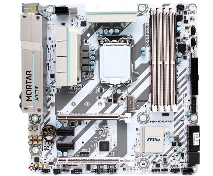 کمپانی MSI مادربرد های MORTAR ARCTIC را در دو چیپست H270 و B250 نیز تولید کرده است. این دو مادربرد را می توان به عنوان میان رده های مخصوص بازی و کاربردهای سنگین مد نظر قرار داد. نسخه مورد نظر ما دارای چیپست B250 بوده و از درگاههای ارتباطی  USB 3.1 Type-A / Type-C نیز بهره می برد. رنگ آمیزی مادربردهای MORTAR ARCTIC ترکیبی از سفید و خاکستری است؛ همچنین می توان به استفاده از پوشش اختصاصی در بخش پورتهای ورودی و خروجی I/O، پورت شبکه Intel Gaming LAN، دو پورت خروجی HDMI و DisplayPort، تکنولوژی Steel Armor در بخش شکافهای PCI-E برای جلوگیری از خم شدگی و تداخلات الکترومغناطیسی و اپلیکیشن Mystic Light با هدف مدیریت نورپردازی این مادربرد اشاره کرد. MSI از LED های سفید رنگ در بخش پشت مادربرد نیز استفاده کرده است. برای اتصال بیشتر نوار های LED و تجهیزات مجهز به این فناوری، می توانید از کانکتورهای 4 پین مختص این مورد استفاده نمائید. در برخی از قسمت های برد شاهد استفاده از هدرهای 4 پین هستیم که می توان پمپ و فن های دیگری را به آنها متصل کرده و از طریق رابط نرم افزاری (نرم افزار Total Fan Control) کنترل کرد.