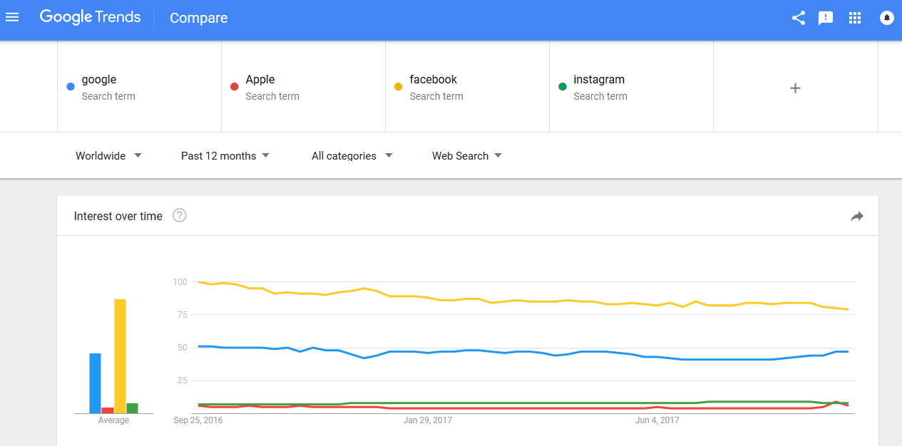 موضوع دیگری که بسیار جالب است، قابلیت مقایسه ی دو عنوان است. همانطور که در تصویر زیر مشاهده میکنید کلمات Google، Facebook، Apple و Instagram را مقایسه کرده ایم و فیس بوک بیشترین جستجو را در دنیا داشته است.