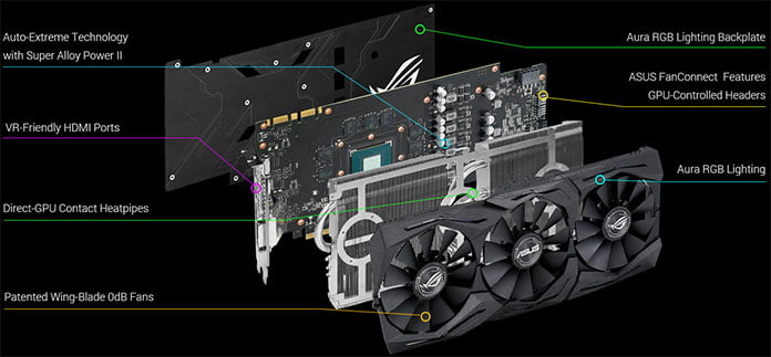 دو پورت HDMI 2.0،دو پورت DP 1.4 و DVI-D نیز برای آنها در نظر گرفته شده است.8 گیگابایت حافظه GDDR5،رابط حافظه 256 بیتی و 1920 هسته CUDA،بی شک در اکثر کارت گرافیک های GTX1070 مشترک است.تفاوت اصلی این دو کارت گرافیک در فرکانس هسته است. Asus GTX 1070 Strix اول با قیمت 429 دلار عرضه می گردد.این کارت گرافیک در فرکانس پایه (Base) به مقدار 1506 گیگاهرتز می رسد و در فرکانس افزایشی (Boost) نیز شاهد رقم 1683 مگاهرتز هستیم.و اما در کارت گرافیک دوم و با قیمت 449 دلار،فرکانس ها به خوبی اورکلاک شده اند.این کارت گرافیک دارای رتبه بندی زیر است: