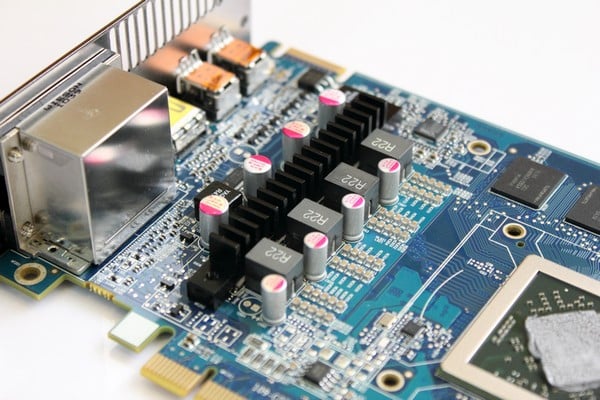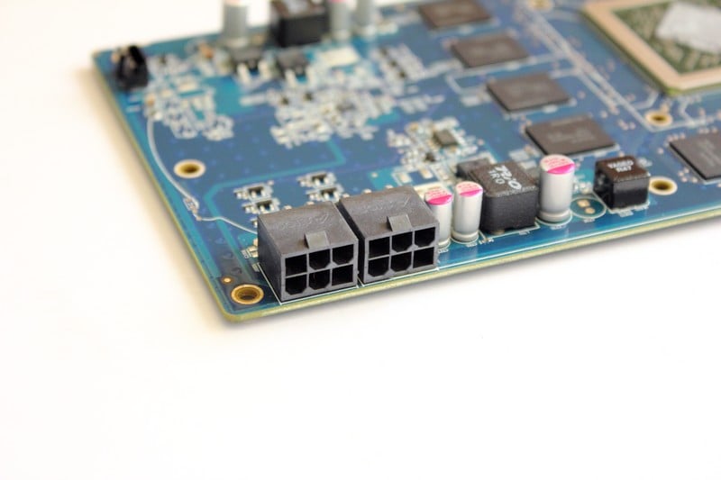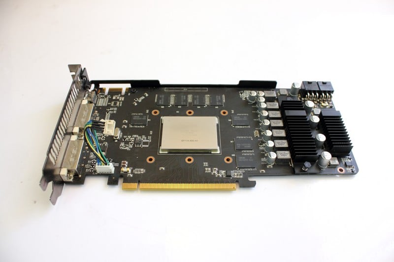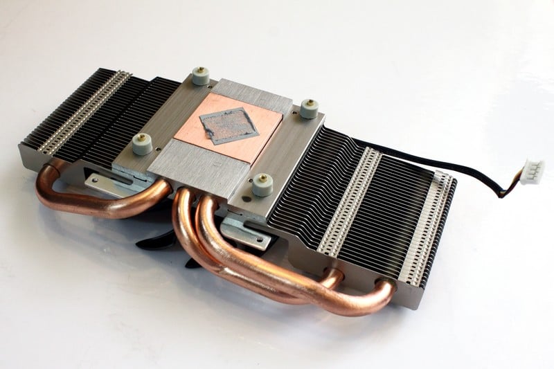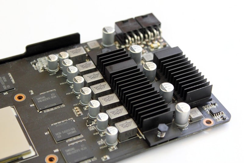 هر یک از فن‌ها دارای اتصال چهار پین است که به کمک یک مبدل به اتصال پنج پین روی کارت‌گرافیک متصل می‌شوند. در سمت راست پردازنده‌گرافیکی و پایین دو اتصال شش پین برق، مدار رگولاتور شش فاز پردازنده‌گرافیکی دیده می‌شود که روی MOSFETهای این بخش یک خنک‌کننده آلومینیومی ساده قرار دارد.