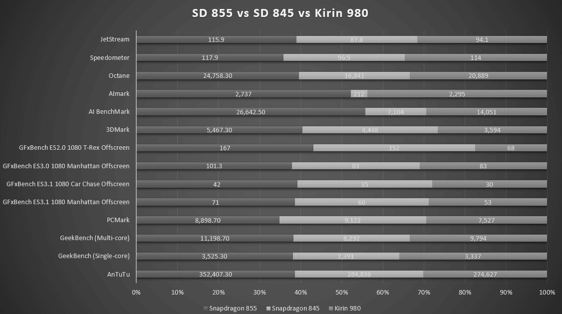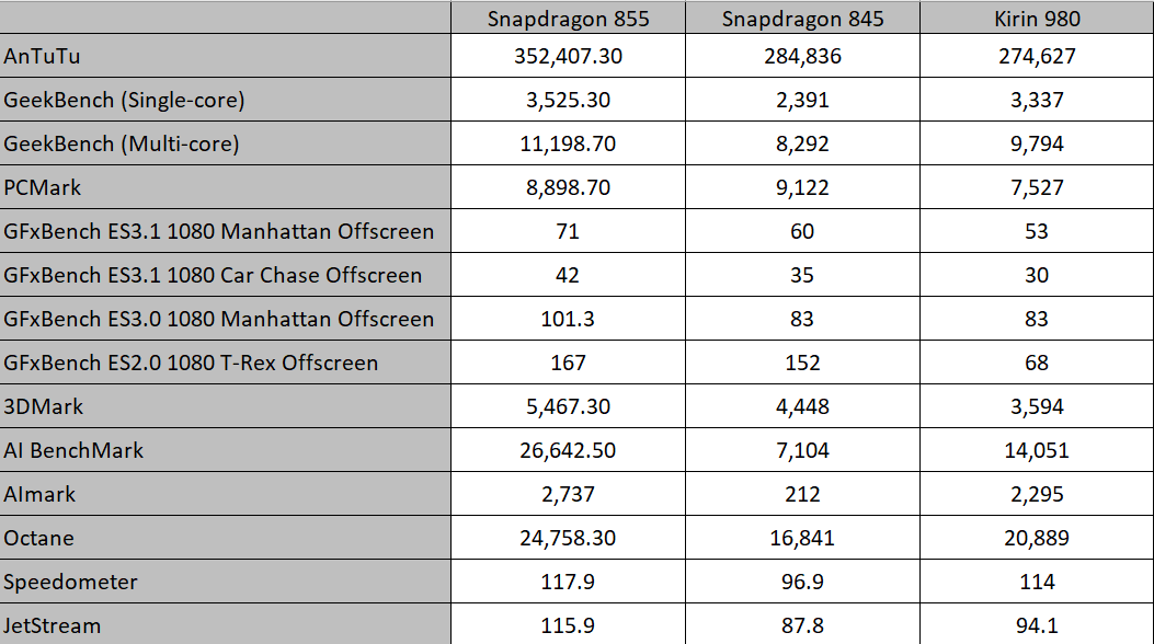 وب سایت XDA اخیرا مقایسه ای کامل از این چیپ ها را منتشر کرده که توجه به آن نکات قابل ملاحظه ای را آشکار می کند. متخصصین این وب سایت از نرم افزارهای رایج و تخصصی بنچمارک برای بررسی عملکرد چیپ های یاد شده استفاده کرده اند. این بنچمارک ها عبارت بوده اند از Geekbench، Antutu، GFXBench، 3D Mark، Almar و Jetstream. برای سنجش عملکرد از سه دستگاه استفاده شده. اسنپ دراگون 855 بر روی دستگاه مرجع کوالکام مجهز به اندروید 9 و 6 گیگابایت حافظه رم قرار داشته، اسنپ دراگون 845 بر روی پیکسل 3 ایکس ال گوگل با اندروید 9 و 4 گیگابایت حافظه رم و کیرین 980 نیز بر روی Honor Magic 2 با اندروید 9 و 8 گیگابایت حافظه رم. برای هر چیپست سه تست انجام شده و سپس میانگین در جدولی آورده شده است.