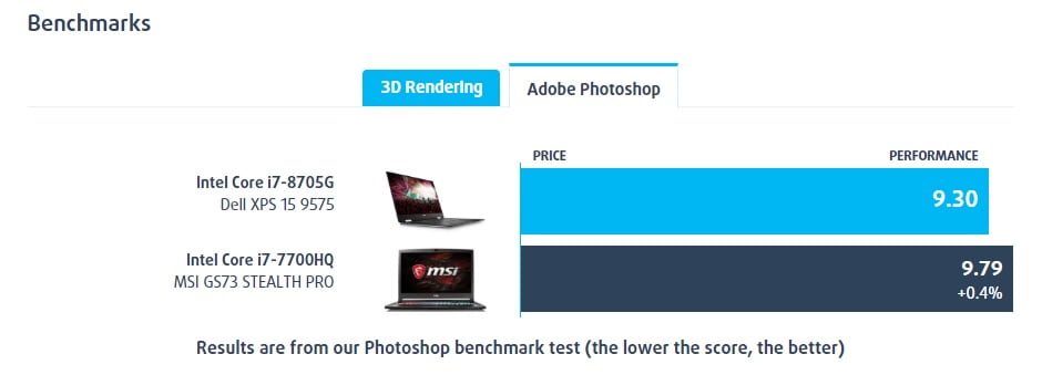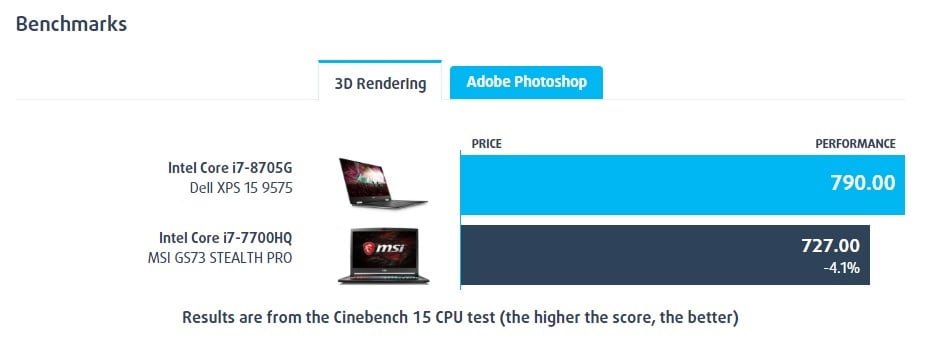 به طور حتم این پرسش به وجود می آید که پردازنده نام آشنای Core i7-7700HQ دست کم در بخش CPU، در برابر Intel Core i7-8705G چه در چنته دارد؟ Intel Core i7-8705G نیز دارای 4 هسته و 8 رشته در بخش CPU بوده از معماری مشابه با 7700HQ بهره می برد. اما در بخش فرکانس، Core i7-8705G با فرکانس بالاتر، در حالت پایه به فرکانس 3.1 و در افزایشی فرکانس 4.1 را پیاده سازی می کند. تراشه Core i7-8705G دارای توان حرارتی 65 وات است. این دو پردازنده در لپ تاپ های MSI GS73 STEALTH PRO و Dell XPS 15 9575 مورد بررسی و مقایسه قرار گرفته اند. تست نخست، مربوط به آزمون رندر 3 بعدی بوده و دومین آزمون نیز به نرم افزار فتوشاپ مربوط است. در بخش رندر 3 بعدی Core i7-7700HQ همچنان برتری خود را نشان داده و در بخش فتوشاپ به تراشه مشترک Core i7-8705G باخته است.