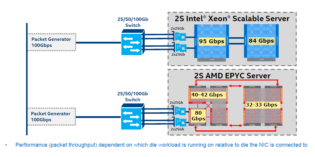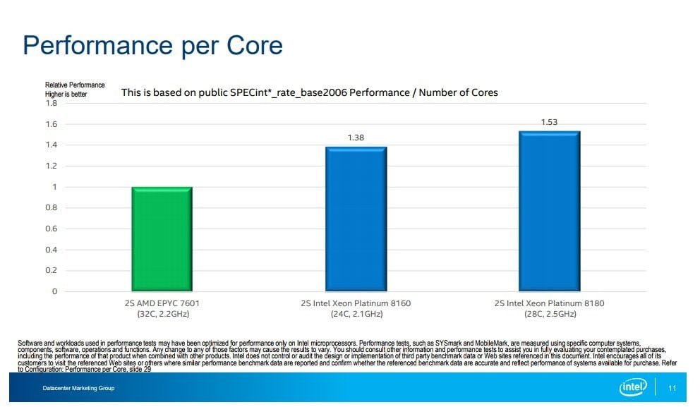 AMD به دلیل استفاده از تکنیک MCM و اتصال چند سیلیکون به یکدیگر، دارای پهنای باند کمتر است؛ هر چند که موارد قابل پشتیبانی آن در بخش رم و توسعه بیش از Intel Xeon ها است، اما کارایی زئون ها چشمگیر تر است. اینتل همچنین با استفاده از متد SPECint کارایی بهتری را به نمایش می گذارد. قیمت Intel Xeon 8160 بسیار رقابتی بوده و ارزش خرید آن از AMD EPYC 7601 بالاتر است، این در حالی است که Intel Xeon 8180 به طور ناگهانی در ازای مقدار افزایش پرفورمنس، قیمت بالاتری را درخواست می کند.