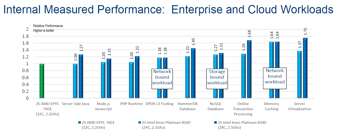 همانطور که در تصاویر نیز مشخص است، با وجود آنکه در برخی پارامترها خصوصا مدل هایی وابسته به کتابخانه های سطح پایین،  Intel Xeon 8160 بسیار نزدیک به AMD EPYC 7601 عمل کرده است و این در حالی است که Intel Xeon 8180 رقیب خود (AMD EPYC 7601) را پشت سر نهاده است. یکی از دلایلی که پردازنده ی AMD EPYC 7601 بازی در این کلاس را به پردازنده Intel Xeon 8180 واگذار کرده است، طراحی پیشرفته در پهنای باند بلوک های داخلی است؛ به طوری که اینتل بلوک ها در بخش هایی نزدیک به یکدیگر تجمیع کرده و پهنای باند داخلی تراشه از رقیب AMD EPYC بالاتر رفته است.