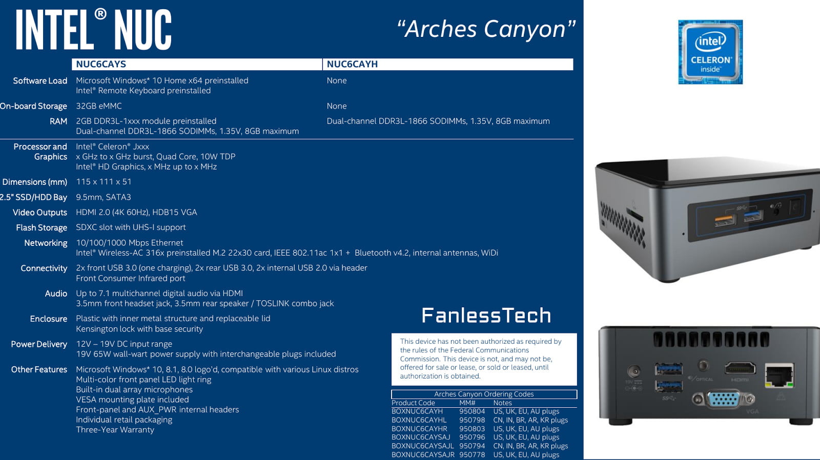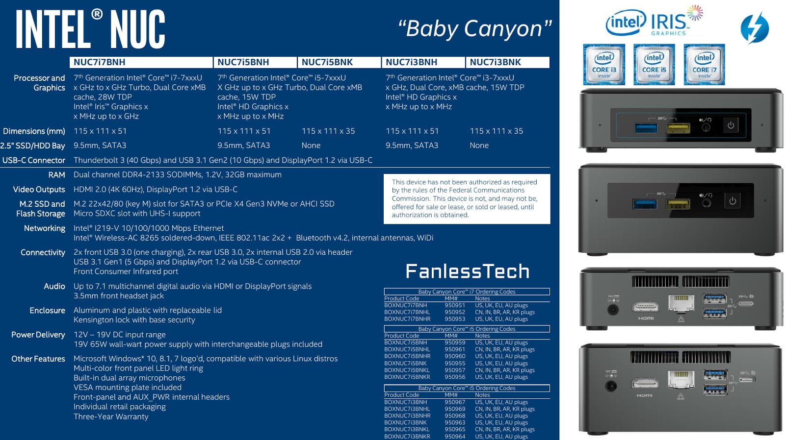 با توجه به پیشرفت سخت افزارها،بسیاری از کاربردهای روزمره و حتی نرم افزاری،توسط این کامپیوترها قابل پردازش هستند.محصولات جدید اینتل،با دو پردازنده جدید از سری i و Celeron عرضه می شوند.کد رمز پردازنده های سری i که شامل مدل های i3،i5 و i7 هستند،Baby Canyon است.پردازنده های کم مصرف تر این محصولات نیز با نام رمز Arches Canyon شناخته خواهند شد.برخی از این کامیپوترها به صورت بدون فن (Fanless) عرضه خواهند شد.در مدل های جدید شاهد استفاده از پورت های USB-C،پورت USB 3.1،رابط HDMI 2.0 با توان پخش تصاویر 4K به همراه فرکانس 60 هرتز،فناوری LED Multi Color،قابلیت VESA،تراشه صوتی با پشتیبانی از 8 کانال HD،قابلیت نصب سیستم عامل های ویندوز و لینوکس،بلوتوث نسخه 4.2،تراشه شبکه اینتل I219-V،تراشه بی سیم AC-8265 و پشتیبانی از دو کانال حافظه رم DDR4 با توان 32 گیگابایت هستیم.