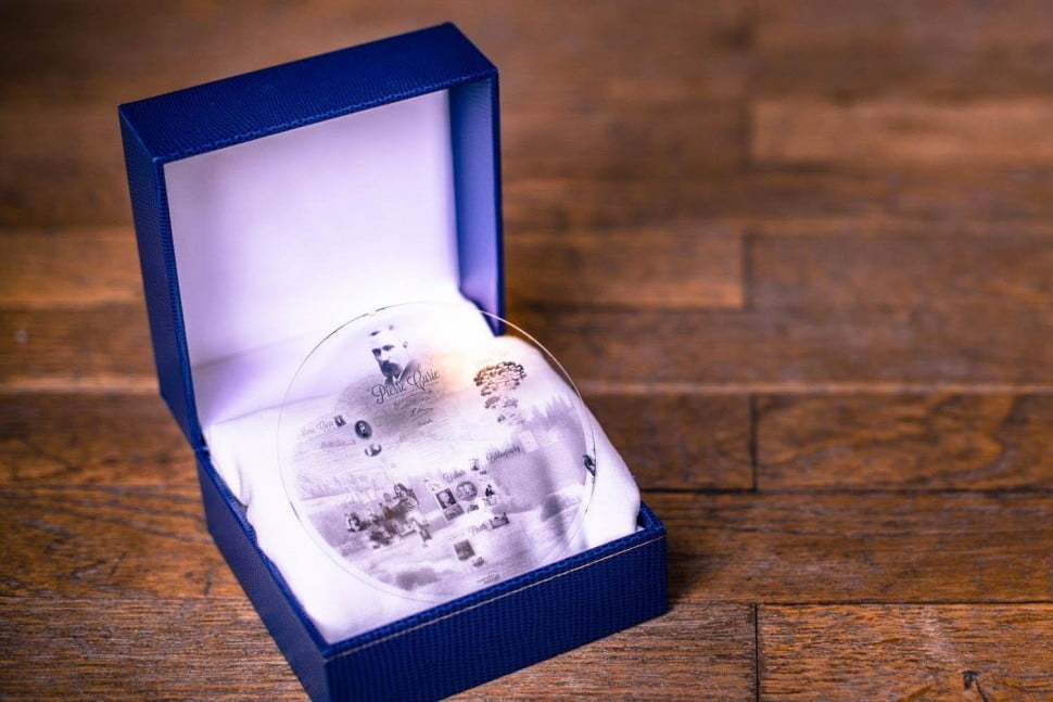 نانوفورم ها در اصل ارتباطی تکنولوژیک بین لوح های سنگی و اسلایدهای میکروفیلم به حساب می آیند و به جای حکاکی شکل های عجیب و غریب روی تخته سنگ ها، ری و بن ذکور از یک فرایند لیزرکاری دقیق برای نوشتن اطلاعات بر روی دیسکی از یاقوت تولید شده در آزمایشگاه، که از لحاظ سختی دومین ماده شناخته شده توسط بشر است، استفاده کرده اند. به کمک این روش، آنها توانسته اند شکل هایی با جزئیاتی بسیار دقیق بر روی یاقوت کبود حک کنند، تا آنجا که برای خواندنشان درست مثل میکروفیلم ها به لنز و ذره بین نیاز است. برای این که تصور دقیقی از این کار داشته باشید، باید خدمتان عرض کنیم که این دو نفر توانسته اند متن کامل کتاب جنگ و صلح را روی یک دیسک 4 اینچی حکاکی کنند و البته تمام این متن تنها یک چهارم از سطح دیسک مورد نظر را پوشانده است. به علاوه، این تکنیک تنها محدود به متن نیست و با استفاده از لیزر می توان هر شکل دلخواهی را روی سنگ حک کرد. البته با این شرط که تصاویر سیاه و سفید باشند. در ادامه نمونه ای از کارهای این شرکت را مشاهده می کنید.