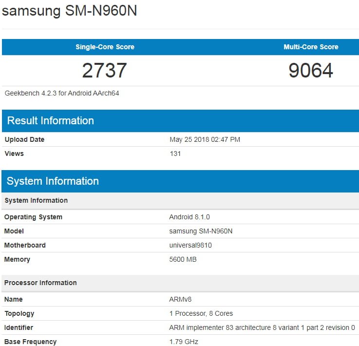 زمانی زیادی از مشاهده گلکسی نوت 9 سامسونگ با چیپ ست اسنپدراگون 845 (با کد SM-N960U) در بنچمارک ها نمی گذرد که حالا پرچمدار آینده کره ای با پردازنده اگزینوس 9810 در بنچمارک رویت شده است. مانند نوت 9 با اسنپدراگون، نتایج بچمارک این گوشی با تراشه اگزینوس و کد SM-N960N در بنچمارک گیکبنچ لو رفته است. این گوشی با اندروید 8.1 اوریو و 6 گیگابایت رم ( نه 8 گیگابایت) مورد آزمایش قرار گرفته است. البته پیش تر نتیجه بنچمارک این گوشی با 8 گیگابایت رم منتشر شده بود که بعدها اعلام شد، جعلی بوده است.