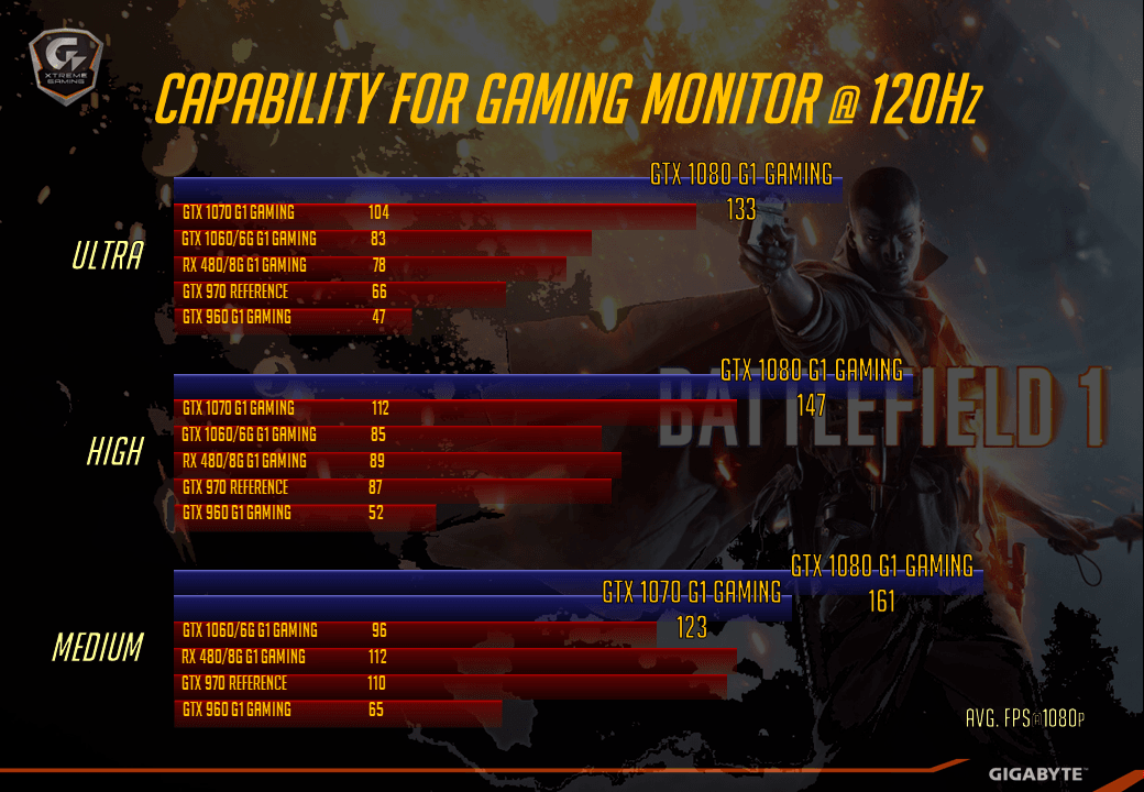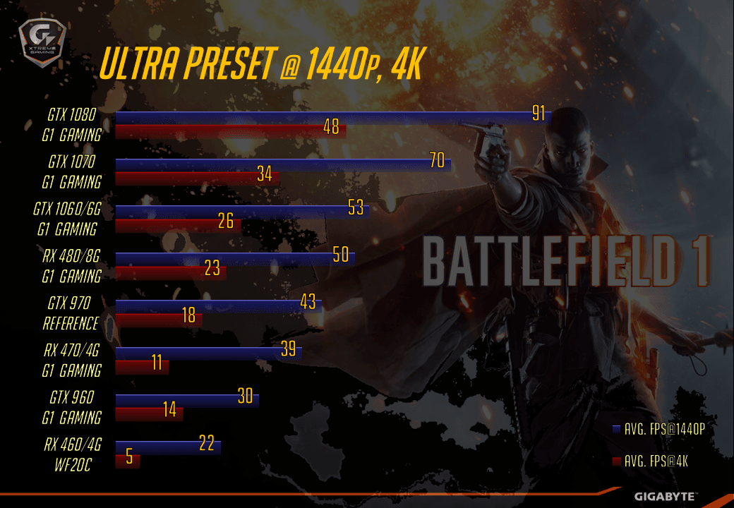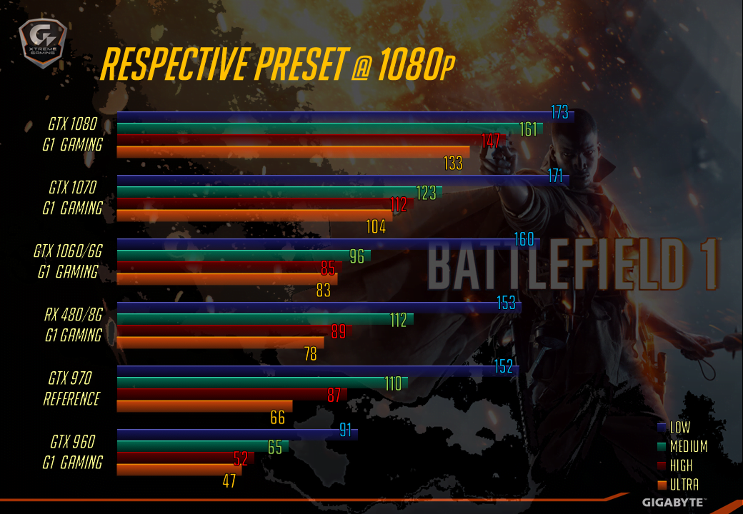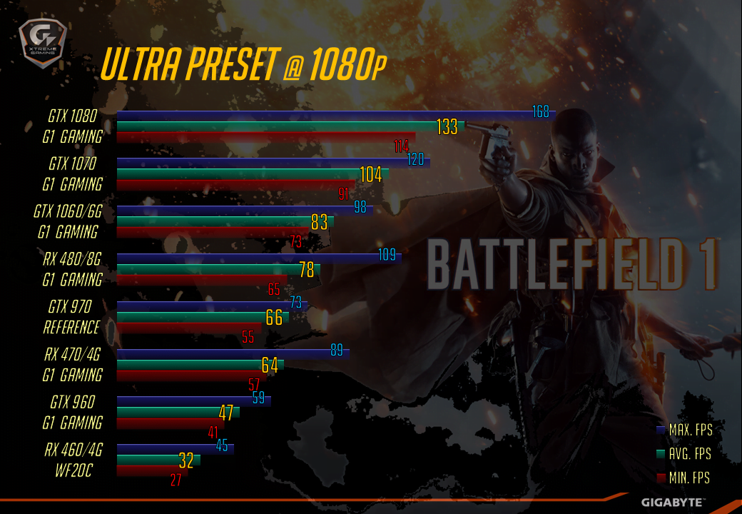 بازی بتلفیلد 1 نیز توسط آخرین نسخه از موتور Frostbite 3 تولید شده است. این موتور در نمایش جزئیات بافتی، ایجاد سایه های بسیار شبیه به واقعیت و بازخورد اتفاقات در اشیاء شهره است. این بازی در جنگ جهانی اول روایت می شوند و در آن خبری از تسلیحات مدرن و جنگ های الکترونیکی وجود ندارد. در ادامه می توانید شاهد نتایج بدست آمده از کارت گرافیک های گیگابایت باشید.