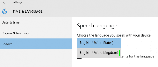 پس از دانلود بر روی Settings در بخش Speech کلیک کنید و زبان یا لهجه ی مورد نظرتان را انتخاب نمایید.