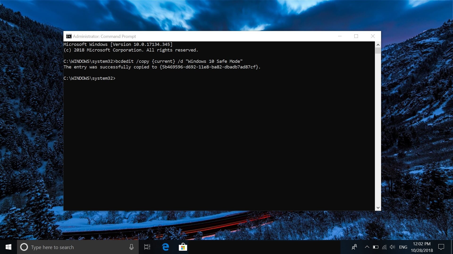 “bcdedit /copy {current} /d “Windows 10 Safe Mode