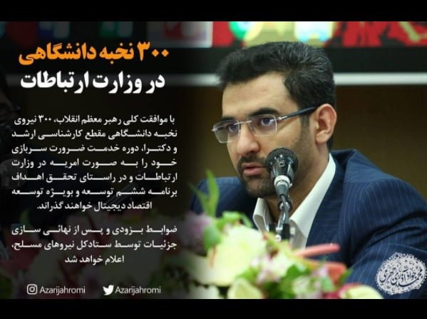 محمد جواد آذری جهرمی ساعاتی قبل در حساب شخصی اینستاگرام خود اعلام کرد که 300 نخبه دانشگاهی مقطع کارشناسی ارشد و دکترا می توانند دوره خدمت سربازی خود را به صورت امریه در وزارت ارتباطات بگذرانند.  او گفت: