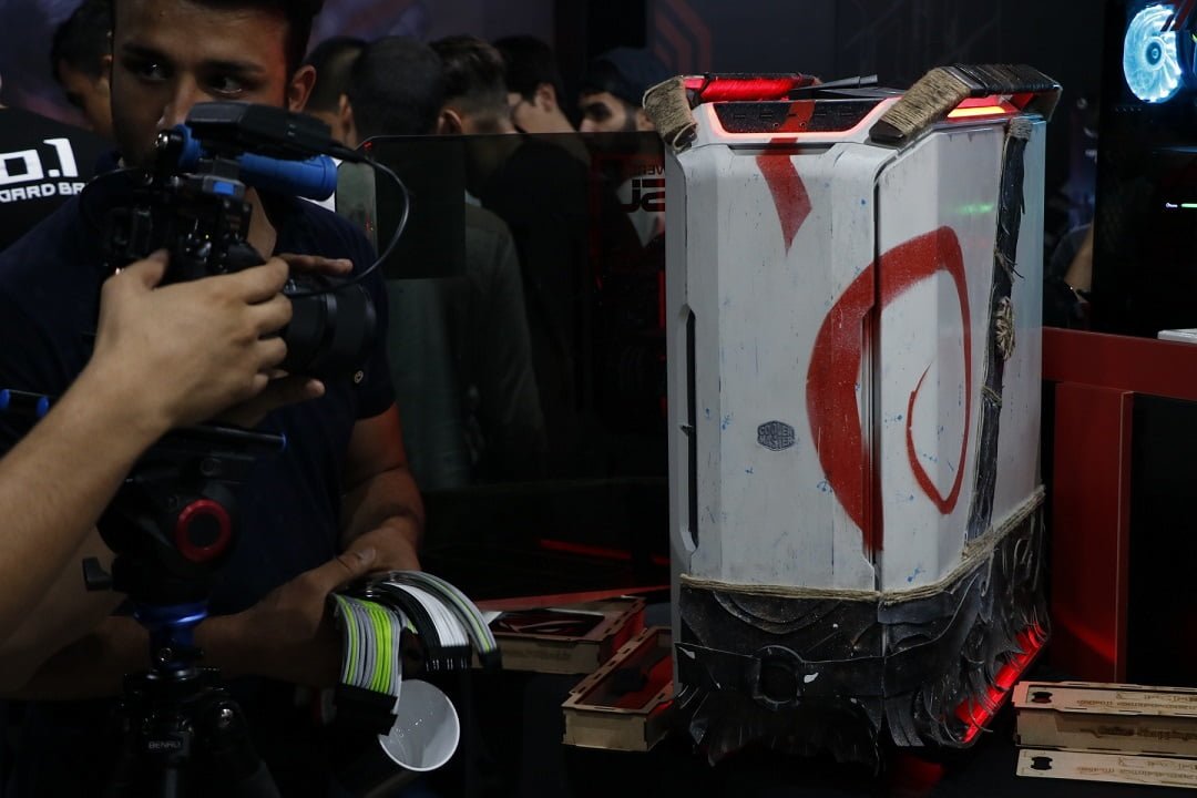 آقای حیدرپور به توضیحاتی در مورد آخرین پروژه مادینگ خود برای حاضرین پرداختند: “… طراحی این کیس از شخصیت اول بازی محبوب GOD OF WAR الهام گرفته شده است. در مادینگ سه نکته حائز اهمیت است. زیبایی، اورکلاک و افزایش کارایی و خنک سازی قطعات. کیس، خنک کننده و منبع تغذیه که از طرف شرکت کولرمستر تامین شده، زیبایی و خنک سازی را به بهترین شکل ممکن در اختیار ما قرار داده است. کارایی هر سیستم ارتباط مستقیمی به مادربورد و کارت گرافیک دارد.مادربورد استفاده شده در این پروژه بهترین مادربورد تولید شده برای چیپ ست X299 در بین همه برندها یعنی  ROG RAMPAGE VI EXTREME استفاده شده است. دلیل علاقه ما به این مادربورد، کارایی بسیار بالا در کنار زیبایی خاص آن است. همه برندها برای نورپردازی RGB از نور های LED ساده استفاده می کنند که ایسوس در این مادربورد از متریالهایی ویژه استفاده کرده که نور را در چند لایه مختلف به بهترین شکل ممکن با جلوه هایی زیبا پخش می کند…. سپس به توضیحاتی در مورد آخرین تجهیزات تولید شده کارگاه PCMOD پرداخت… .”