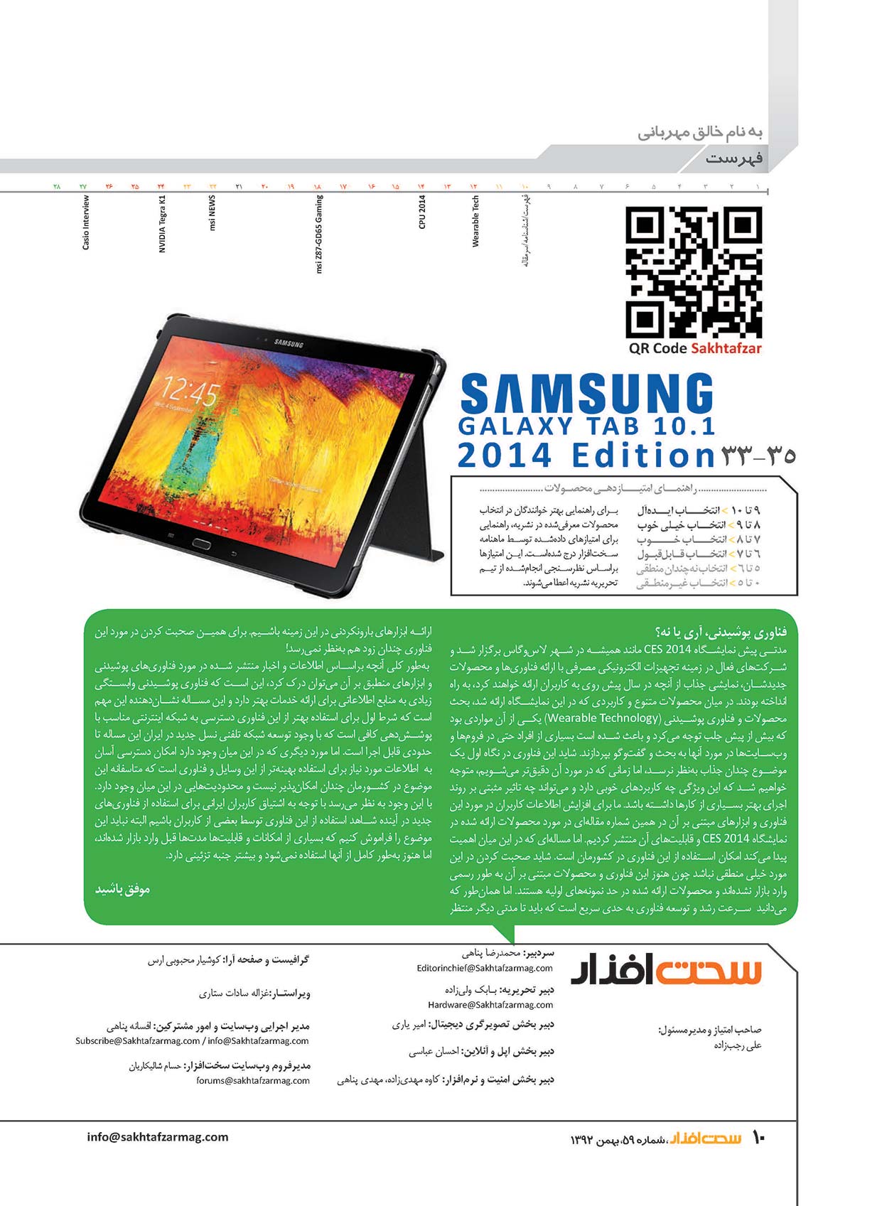 این شماره را با مقالات فناوری در زمینه سخت افزاری شروع کردیم. از ان جایی که محصولات چندان جدیدی برای بررسی وجود نداشت تصمیم گرفتیم، با مقالات فنی خوب وزن محتوای مجله را بالا ببریم. این مقالات در مورد فناوری جدیدی است که در نمایشگاه CES سال 2014 ارائه شده است و همچنین بخشی از آن مربوط به برنامه شرکت های سازنده پردازنده برای برنامه آینده خودشان است.