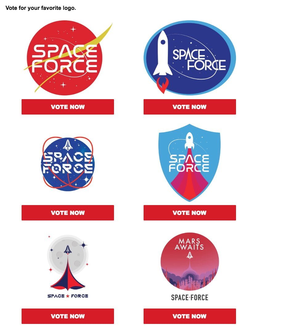 این کمیته روز گذشته ایمیلی را برای طرفداران ثبت شده دونالد ترامپ ارسال کرده و از آنها درخواست نموده از میان شش لوگوی پیشنهادی برای نیروی فضایی آمریکا یک مورد را انتخاب نماید. ظاهرا این کمیته قصد دارد بر اساس لوگوی انتخاب شده مجموعه ای از تجهیزات را سفارش داده و تولید نماید. تمامی این شش لوگو که تصویر آن را مشاهده می کنید یادآور نمادهای کلاسیک عملیات فضایی آمریکا هستند و حتی یکی از آنها تا حد بسیار زیادی مشابه لوگوی ناسا است (حتی فونت آن هم مشابه فونت ناسا طراحی شده و تنها تفاوت موجود رنگ قرمز و طلایی لوگو است). همچنین در یکی دیگر از لوگوها عبارت Mars Awaits به معنی مریخ در انتظار است به چشم می خورد؛ این در حالیست که بر اساس توضیحات ارائه شده نیروی فضایی آمریکا هیچ ارتباطی با مریخ و سفر به آن ندارد!