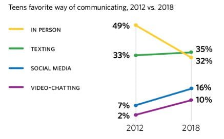 شمار نوجوانانی که تلفن هوشمند دارند در سال‌های اخیر به شدت افزایش یافته است، درحالی که در سال 2012 فقط 41 درصد از آن‌ها تلفن هوشمند داشتند؛ امروزه این رقم به 89 درصد رسیده است. این افزایش چشم‌گیر تلفن‌های هوشمند در نوجوانان، در انتخاب راه ارتباطی آن‌ها با یک‌دیگر نیز تاثیر گذار بوده است. درحالی که در سال 2012 راه منتخب، دیدار رو در رو بوده است، امروز در سال 2018 جای خود را به فرستادن پیام داده است. همچنین به لطف گوشی‌های بهتر و اینترنت پرسرعت‌تر نسبت به گذشته، حالا چت‌های ویدئویی راه مورد علاقه 10 درصد از نوجوانان برای برقرای ارتباط می‌باشد.