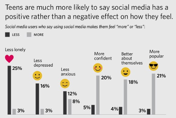 البته نتایج این نظرسنجی نشان می‌دهد که نوجوانان نگاهی مثبت به رسانه‌های اجتماعی دارند، یک چهارم از شرکت کنندگان بر این عقیده‌اند که رسانه‌های اجتماعی باعث می شود که کمتر حس تنهایی به آن‌ها دست دهد و از هر پنج نوجوان، یک نفر از آن‌ها اعتقاد دارد که رسانه‌های اجتماعی به آن‌ها اعتماد به نفس بیشتری می‌دهد و باعث محبوبیت بیشتر آن‌ها می شود.