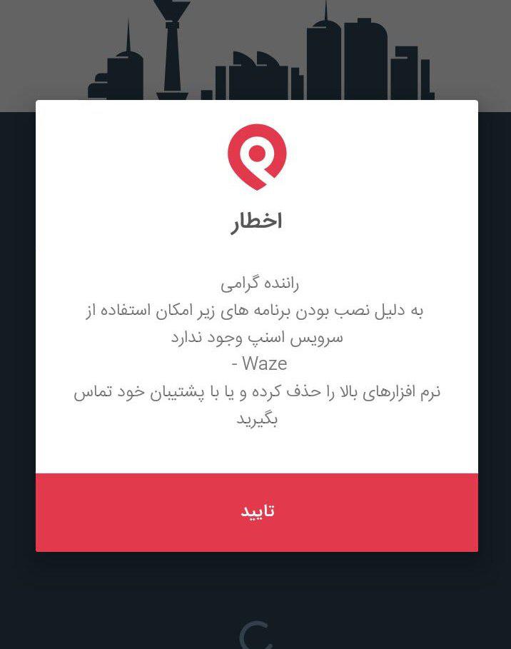 بر اساس گزارشات متعدد منتشر شده در شبکه های اجتماعی، آن دسته از کاربرانی که به عنوان راننده یکی از اپلیکیشن های اختصاصی اسنپ، تپ سی یا کارپینو را بر روی گوشی خود نصب کرده اند پس از باز کردن برنامه با پیامی مواجه می شوند که به آنها دستور می دهد برای ادامه استفاده از برنامه ابتدا اپلیکیشن Waze را از روی گوشی خود پاک کنند.