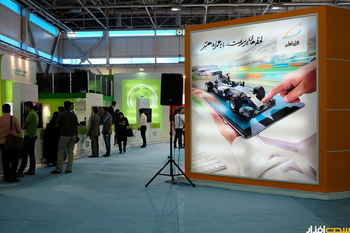 تاکید روی اینترنت پر سرعت نسل سوم یکی از مواردی است که همراه اول تاکید زیادی روی آن دارد. تصویر شخص کت و شلوار پوش که روی یک ماشین فرمولا وان ثابت نشسته و با رضایت گوشی خود را بدست گرفته است، می خواهد به ما بگوید که شخص مورد نظر از اینترنت پر سرعت روی گوشی لذت می برد (حالا توضیح اینکه ترکیب این سه عامل در تصویر واقعاً چگونه بیانگر سرعت بالای اینترنت نسل سوم روی گوشی است را به خود همراه اول میسپاریم!). در بخش های مختلف غرفه همراه اول سرویس ها و خدمات مختلف این اپراتور معرفی شده و بخشی نیز برای نمایش گوشی های هوشمند از برند های مختلف در نظر گرفته شده است.