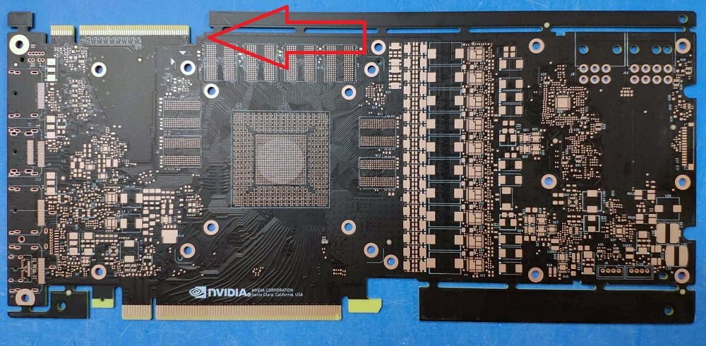 در قسمت بالای این مدار چاپی، درست در بخش رابط SLI، یک آرایش جدید را نظاره گر هستیم؛ انویدیا در سال 2016 و با معرفی کارت گرافیک های Pascal، یک رابط جدید SLI با نام SLI HB را معرفی کرد که دارای پهنای باند به مراتب بیشتر از SLI ساده است. با این وجود تمامی کارت گرافیک های انویدیا در گونه های پاسکال، این رابط را دریافت نکرده و تنها در مواردی خاص شاهد استفاده از SLI HB بودیم. به گفته انویدیا، به دلیل برگشت پذیر بودن SLI HB، پهنای باند آن به 2 برابر افزایش یافته بود.