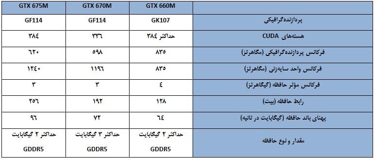 طبق روال معمول NVIDIA، برخی مدلهای قبلی تغییرنام یافته و دوباره عرضه شدهاند. همانطور که در جدول 1 مشاهده میشود، GTX 675M و GTX 670M در واقع همان GTX 580M و GTX 570M هستند (البته در GTX 670M فرکانس هسته کمی افزایش یافتهاست). نکتهای که در اینجا وجود دارد، نحوه نامگذاری NVIDIA است و به نظر میرسد یک جای خالی برای کارتی به نام GTX 680M نیز در نظر گرفته شدهاست!