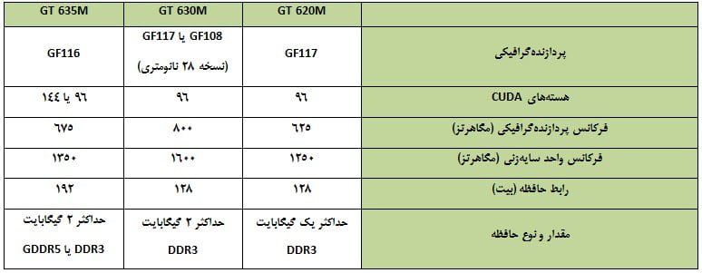 در اینجا میبینیم که GT 555M تغییرنام یافته و با نام GT 635M عرضه شدهاست. کارتگرافیک GT 630 نیز به دليل استفاده از دو نوع مختلف پردازندهگرافیکی میتواند برای خریداران دردسرساز شود. از آنجا که GT 630 قرار نیست کارایی بالایی داشتهباشد، پس میتوان انتظار داشت، مدل مجهز به پردازندهگرافیکی 28 نانومتری که توان مصرفی کمتری خواهدداشت، مشتریان بیشتری داشتهباشد (البته به شرطی که مشتریان بتوانند بفهمند، کدام مدل روی نوتبوک موردنظرشان نصب شدهاست).