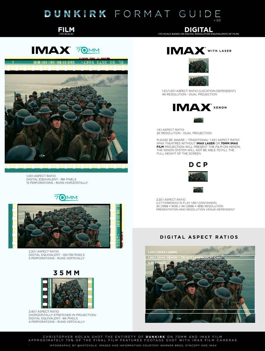 اما کریستوفر نولان برای فیلم دانکیرک (Dunkirk) تلاش کرد از سیستمی برای ضبط و پخش فیلم استفاده کند که استانداردهای IMAX را تا مرز توانایی های فیزیکی به پیش می برد. آنچه نولان از آن استفاده کرده در حال حاضر با نام IMAX هفتاد میلیمتری شناخته می شود. IMAX 70 میلیمتری نوعی فرمت نمایش تصویر است که از فیلم های مخصوصی با ابعاد دو برابر بزرگتر از فیلم های 35 میلیمتری استفاده می کند. در نتیجه استفاده از فیلم های بزرگتر، وضوح بیشتری نسبت به تصاویر کلاسیک و حتی IMAX های قدیمی تر نیز به دست خواهد آمد. مدل 70 میلیمتری هم از نسبت تصویر 1.43:1 استفاده می کند که باعث “مربعی تر” شدن تصاویر می شود و البته کیفیت صوتی نیز به دلیل وجود فضای بیشتر برای انکود کردن ترک های صوتی فراگیر به میزان فوق العاده زیادی افزایش می یابد. اما شاید هیجان انگیز ترین نکته درباره استفاده از این فرمت، افزایش وضوح فیلم به میزان خیره کننده 18K می باشد که تا به حال نظیر آن در هیچ فیلمی مشاهده نشده و البته تنها سینماهای محدودی در جهان هستند که بتوانند این فیلم را با کیفیت واقعی آن به نمایش بگذارند.