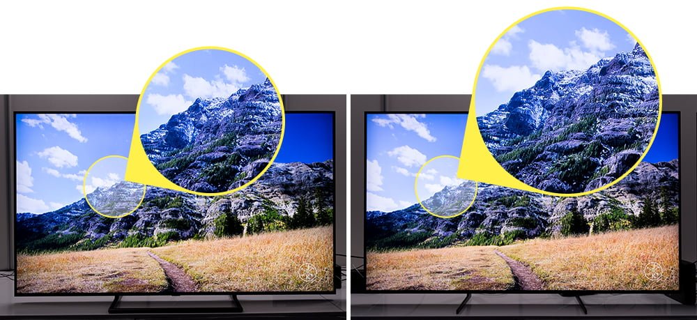 برای اینکه محتواهای اچ‌دی و فول‌اچ‌دی در تلویزیون‌های 4K به خوبی نمایش داده شوند از قابلیت ارتقا رزولوشن یا Upscaling بهره گرفته می‌شود. در این قابلیت تلویزیون‌ براساس یکسری الگوریتم مشخص رزولوشن ویدئوها را برای مشاهده با کیفیت‌تر افزایش می‌دهد.