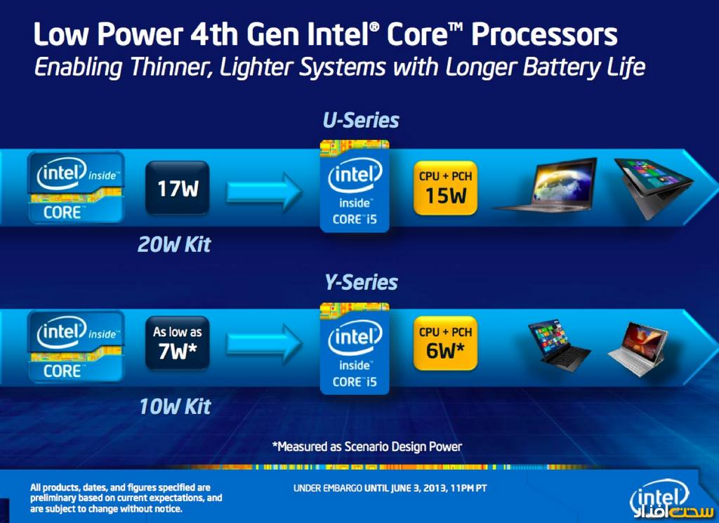 وارد بازار کند که در این محصولات، تغییرات بسیاری نسبت به پردازنده های Haswell صورت گرفته است. اولین تغییر در بخش مدار تغذیه است که از حالت مجتمع خارج شده و بار دیگر شاهد حضور پل شمالی برای کنترل ولتاژ خواهیم بود. با افزایش قدرت و بهینه سازی پردازنده مجتمع گرافیکی، اینتل در نظر دارد تا شتاب دهنده OpenCL را به پردازنده های جدید خود اضافه کند که به پردازش های موازی کمک قابل توجهی خواهد کرد. معماری ساخت 14 نانومتری برادول سبب کاهش توان مصرفی خواهد شد، این مساله ای است که روی توان مصرفی پردازنده ها و همچنین حرارت تولیدی آنها بسیار تاثیرگذار خواهد بود. طبق اعلام اینتل، در پردازنده های برادول مخصوص نوت بوک و آلترابوک، توان مصرفی به 15 وات و در نمونه های مخصوص تبلت، این مورد به 6 وات کاهش یافته است (تصویر 2).