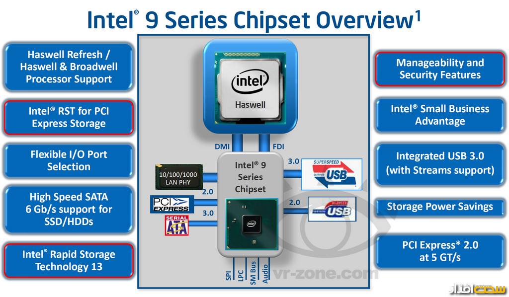 آغاز شود تا نسل جدیدی از حافظه ها توسط کاربران مورد استفاده قرار گیرد. حافظه های DDR4 علاوه بر افزایش ظرفیت ماژول ها، توان مصرفی کمتری دارند که این مساله برای سیستم های سرور و WorkStation که به حجم بالایی از حافظه مجهز می شوند، باعث کاهش توان مصرفی می گردد. همچنین برای سیستم های سرور مخصوص پردازش گرافیکی و سه بعدی، اسلات های PCI 3.0 موجود به صورت 40 مسیر فعالیت خواهند کرد که سبب افزایش سرعت انتقال پهنای باند به مادربورد می شود. نسل جدید پردازنده های Atom اینتل (بر پایه معماری Airmount) برای سیستم های میکرو سرور نیز عرضه می شود که البته به صورت سیستم روی یک چیپ طراحی و تولید خواهند شد که استفاده از آنها در Ultrabook و Notebook های نسل آینده سبب بهبود کارآیی بسیار مناسب در زمینه قدرت پردازشی و همچنین توان مصرفی می شود. اینتل در سال 2014 برنامه ای برای معرفی سوکت جدید ندارد و تنها به ارائه چیپ ست جدیدی مانند X99 (تصویر 5) خواهد پرداخت.