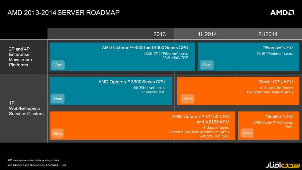 همچنین به سه قابلیت OpenCL، Direct Compute و API مجهز خواهند بود که قابلیت API (مخفف Application Programming Interface) سبب افزایش سرعت اجرای برنامه ها می شود. تمرکز دو رقیب دیرینه در سال 2014 روی تولید پردازنده های 64 بیتی مجهز به پردازنده مجتمع گرافیکی است و در این زمینه نیز با ارائه فناوری موازی سازی فعالیت هسته های پردازنده و پردازش به صورت ناهمگن، قدرت پردازنده های خود را بهبود خواهند بخشید. در سال 2014 شاهد افزایش بسیار مناسب پردازنده های مجتمع گرافیکی APU ها خواهیم بود، اما در بخش عملکرد هسته های X86، رشد عملکرد پردازشی با سرعت بسیار کمی صورت خواهد گرفت. بازار تبلت ها و آلترابوک ها در سال 2014 نیز داغ خواهد بود و شرکت AMD نیز مانند رقیب خود، اقدام به تولید SOC و پردازنده های کم مصرف با عملکرد مناسب خواهد کرد. برای تولید این محصولات جدید از فناوری ساخت Jaguar و Puma بهره گرفته می شود، هر چند این پردازنده ها کارآیی خوبی خواهند داشت، اما قادر به مقابله با پردازنده های Haswell کمپانی اینتل نخواهند بود. پردازنده های فوق کم مصرف AMD در سال 2014 جزو خانواده Puma قرار می گیرند و توان مصرفی آنها در بهترین حالت به 10 وات در ساعت خواهد رسید، این در حالی است که پردازنده های مشابه اینتل با توان مصرفی کمتر از 10 وات (پردازنده های سری Core Y با مصرف 6 تا 7 وات در سال 2014 معرفی خواهند شد)، بار دیگر گوی سبقت را از رقیب خود می رباید. SOC های کم مصرف و فوق کم مصرف AMD در نیمه ابتدایی سال 2014 قدم به تبلت های جدید می گذارند و در انتهای سال جدید میلادی نیز شاهد حضور سیستم روی یک چیپ قدرتمند بر پایه پردازنده Cortex-A57 خواهیم بود. پس از معرفی پردازنده های مخصوص سیستم های خانگی و تجهیزات همراه، نوبت به پردازنده های قدرتمند مخصوص سیستم های سرور فرا رسیده که شامل دو خانواده Warsaw و Berlin می شود. پردازنده های Warsaw به تعداد 12 تا 16 هسته پردازشی بر پایه معماری Piledriver مجهز خواهند بود که در حقیقت نسخه بهینه سازی شده از نسل پردازنده های FX به شمار خواهند رفت. همچنین پردازنده های Berlin نیز ادامه دهنده راه خانواده Opteron خواهند بود که امکاناتی مانند استفاده از معماری Steamroller، واحد پردازش گرافیکی GCN و ویژگی HSA به آنها اضافه می شود. پردازنده های Berlin در سال 2014 جایگزین پردازنده های چهار و هشت هسته ای Opteron خواهند شد.