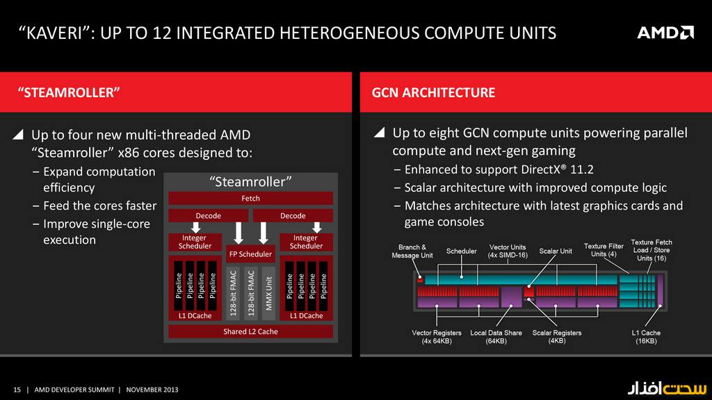 نیز بر پایه سوکت نسل دوم رونمایی گردد. به دلیل پشتیبانی مادربورد های FM2/FM2+ از پردازنده های مشابه، نمی توان این دو سوکت را جدا از یکدیگر دسته بندی کرد و تنها مواردی به عنوان بهینه سازی در سوکت FM2+ دیده می شوند. هر چند AMD بسیار تلاش می کند تا FM2+ را به عنوان یک سوکت جدید معرفی کند، اما باید به این نکته اشاره کنیم که قرار نیست تمام سخنان شرکت های سخت افزاری و نرم افزار را باور کنیم! نسل سوم پردازند های APU کد Kaveri را بر اساس معماری ریز پردازنده Steamroller در تاریخ 14 ژانویه 2014 معرفی می کند. معماری Steamroller در حقیقت یادگار پردازنده های خانواده Bulldozer و Piledriver است و قدرت پردازشی سوکت AM3+ را در کنار قدرت پردازنده مجتمع گرافیکی APU یکپارچه سازی خواهد کرد. پردازنده های Kaveri (تصاویر 8 و 9)