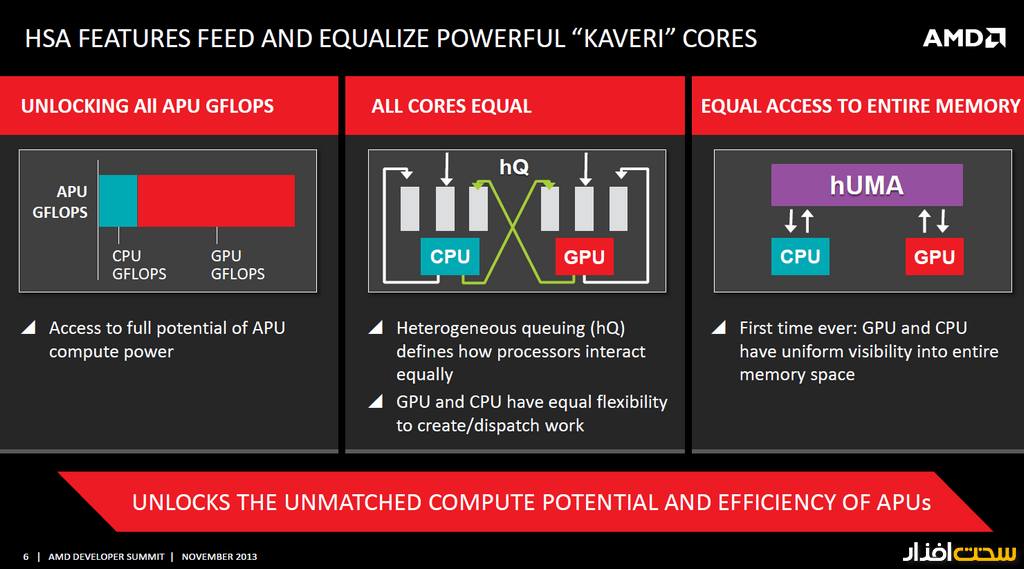 با قابلیت HSA قادر به ارائه کارآیی بالاتر خواهند بود که می توان به مواردی مانند دسترسی به قدرت کامل پردازنده مجتمع گرافیکی، صف بندی ناهمگن برای فعالیت بهتر هسته های پردازنده، فعالیت متناسب پردازنده مرکزی و پردازنده مجتمع گرافیکی و دسترسی هر دو واحد به حافظه (قابلیت hUMA) اشاره کرد (تصویر 10).