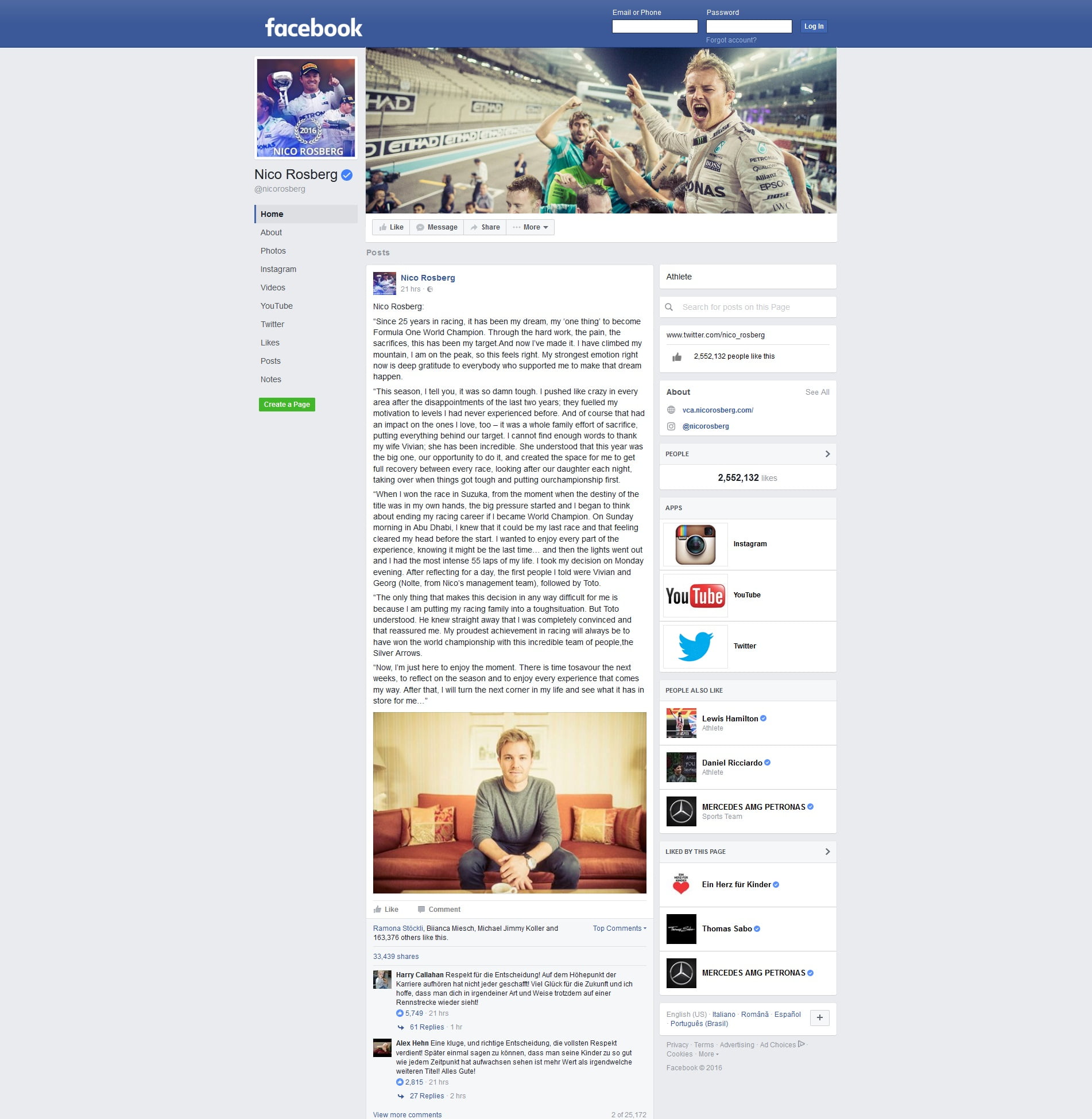 یکشنبه گذشته آخرین مسابقه فصل فرمول 1 برگزار شد و رقابت های نفسگیر دو راننده مرسدس بنز بر سر امتیازات قهرمانی تنها با 5 امتیاز اختلاف به پایان رسید. در حالی که لوییس همیلتون در این فصل موفق به پیروزی در 10 مسابقه شده بود، اما با کسب تنها 380 امتیاز و با 5 امتیاز کمتر نسبت به هم تیمی آلمانی خود یعنی نیکو رزبرگ که 9 مسابقه این فصل را با پیروزی به پایان رسانده بود در جایگاه دوم قرار گرفت. رزبرگ موفق شد تا اولین قهرمانی را در کارنامه خود به ثبت برساند اما بعد از این قهرمانی با اعلام خبری در صفحه فیسبوک خود شوک بزرگی به هواداران دنیای موتور اسپورت وارد کرد.