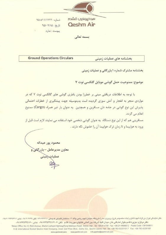در این بخشنامه آمده است؛ «با توجه به اطلاعات دریافتی مبنی بر خطرزا بودن باتری گوشیهای گلکسی نوت7 که در مواردی منجر به انفجار و آتشسوزی گردیده است، بدینوسیله جهت پیشگیری از خطرات احتمالی پذیرش این نوع گوشی در جامهدان مسافرین و همچنین بهعنوان بار غیرهمراه ممنوع اعلام میگردد.