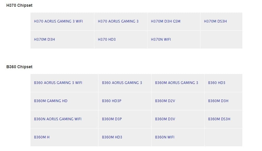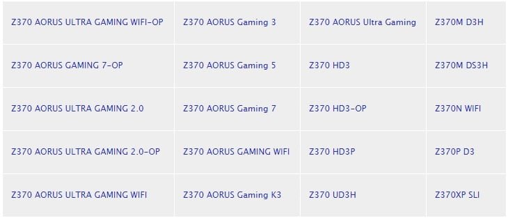 در همین راستا، شرکت گیگابایت به تازگی لیستی از مادربردهای Z370, H370, B360 و H310 خود را منتشر کرده است که با بروزرسانی بایوس، امکان استفاده از CPUهای Core i9000 را خواهند یافت. در ادامه شاهد اسامی مادربردهای فوق خواهید بود تا بدون نیاز به خرید یک مادربرد جدید، امکان بروزرسانی CPU برای شما فراهم گردد.